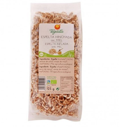 Ingredientes: Espelta inflada 53% , azúcar de caña, sirope de maíz, miel 4% y aceite de girasol de alto oléico. Ingredientes procedentes de la agricultura ecológica. Puede contener trazas de leche, soja, frutos de cascara y sésamo.